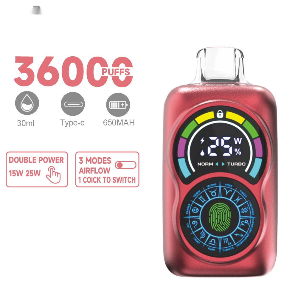 The vaping device features a 30ml oil capacity, capable of delivering 36000 puffs. It is powered by a 650mAh battery and offers nicotine salt options of 0%, 2%, 3%, and 5%. The 0.6ohm mesh coil, combined with functions like MESH COIL, airflow adjustable feature, reliable power supply, and an LED indicator, ensures a satisfying vaping experience. Equipped with a Type – C charging port, it is made of a combination of aluminum alloy and ABS materials.