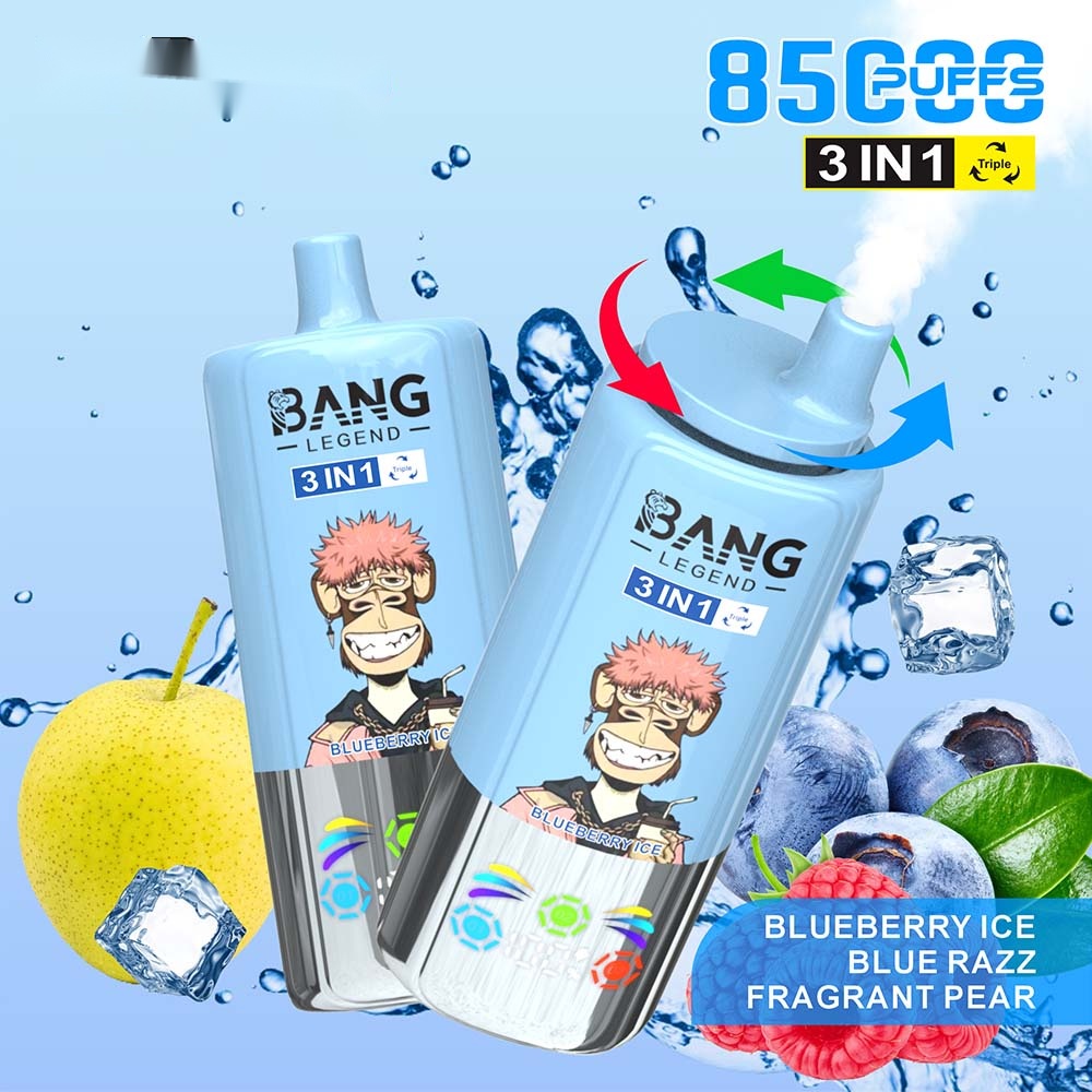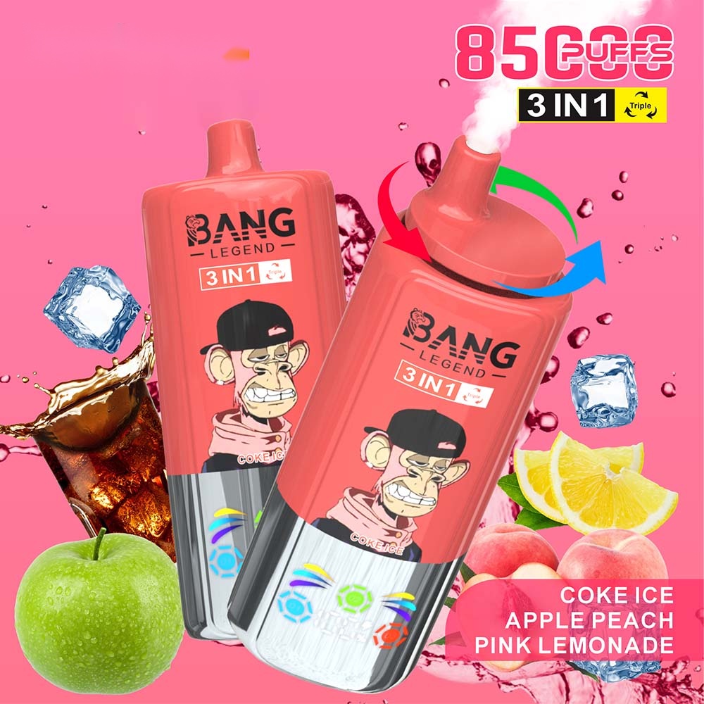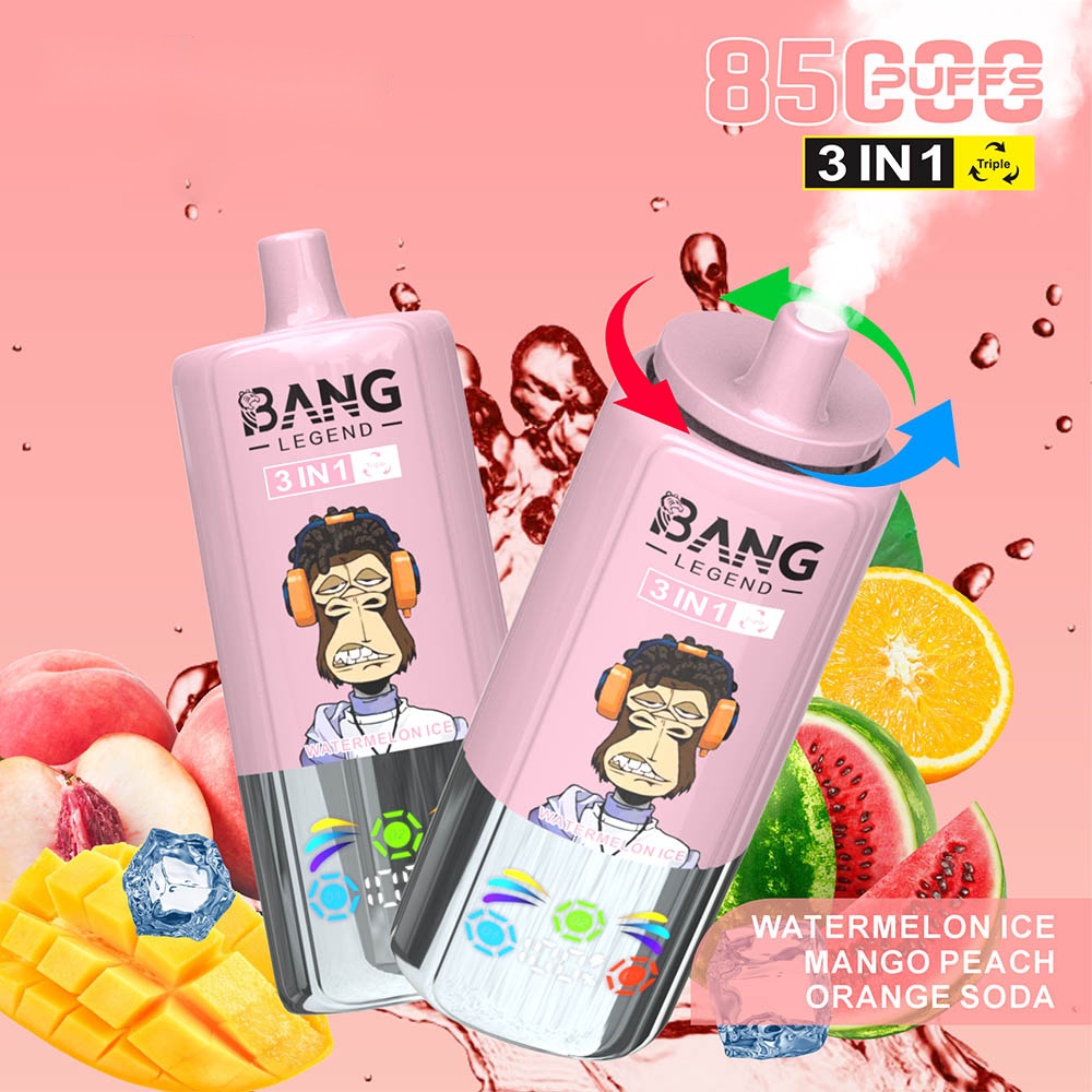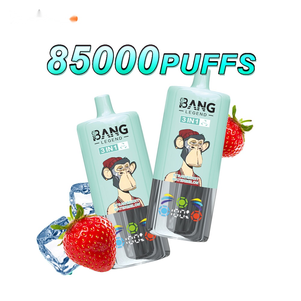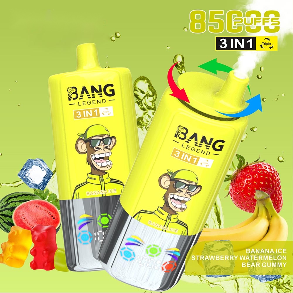 Introducing the Bang Legend 85000 – a premium 3-in-1 disposable vape that redefines convenience and flavor variety. Simply rotate the top to switch between three distinct flavors in one sleek device. Engineered for lasting enjoyment, it delivers up to 85,000 puffs supported by a high-performance mesh coil and a rechargeable Type-C battery. The integrated smart screen keeps you informed of e-liquid and power levels at a glance. Available in multiple nicotine strengths (0%, 2%, 3%, 5%) and featuring a stylish, trend-setting monkey design, it’s the perfect blend of function and fashion.