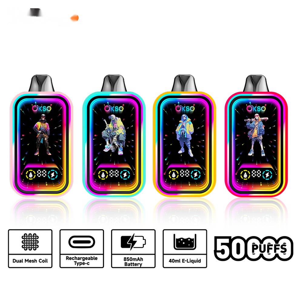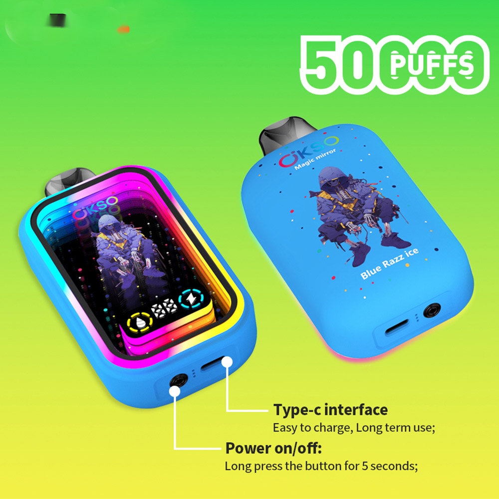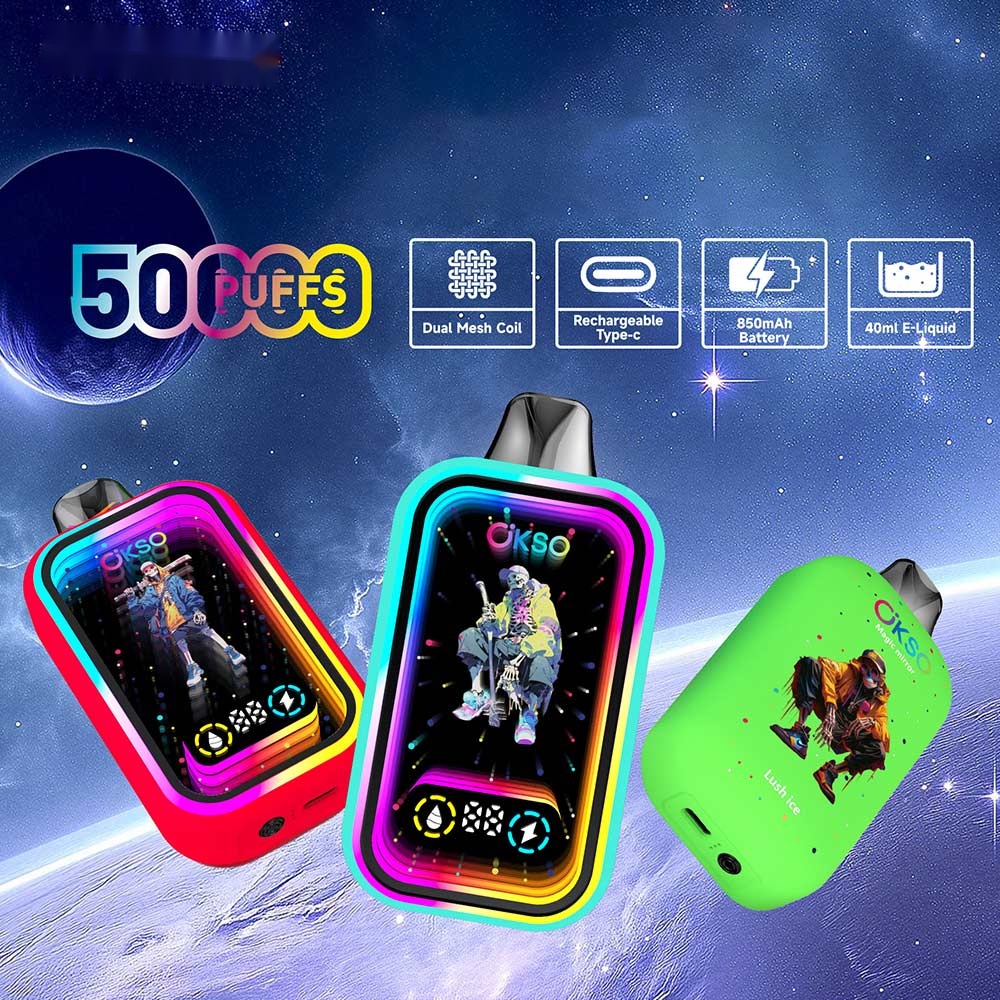 The OKSO Magic Mirror 50000 Puffs Vape boasts a large 40mL e-liquid capacity, a powerful 850mAh built-in battery, and a dual mesh coil design. Enhanced with stylish RGB LED lighting, it delivers a premium vaping experience.