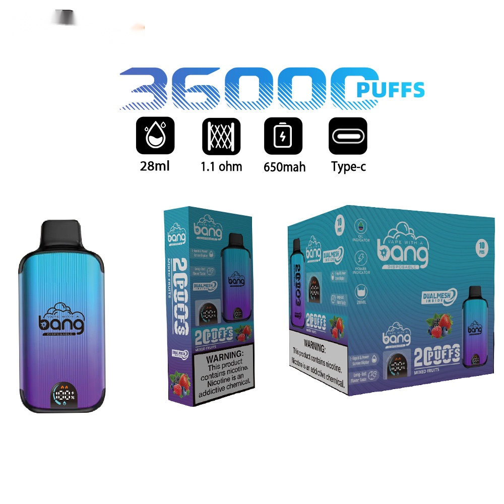 The Bang 20000 Puffs Disposable Vape comes with a 28ml e – liquid capacity, delivering up to 20000 puffs. It’s powered by a 650mAh battery and is rechargeable via a Type – C port. With nicotine strength levels of 0%, 2%, 3%, and 5%, a dual mesh coil for great vapor production, a screen display to show e – liquid and power status, and 16 available flavors, it provides a comprehensive vaping experience.
