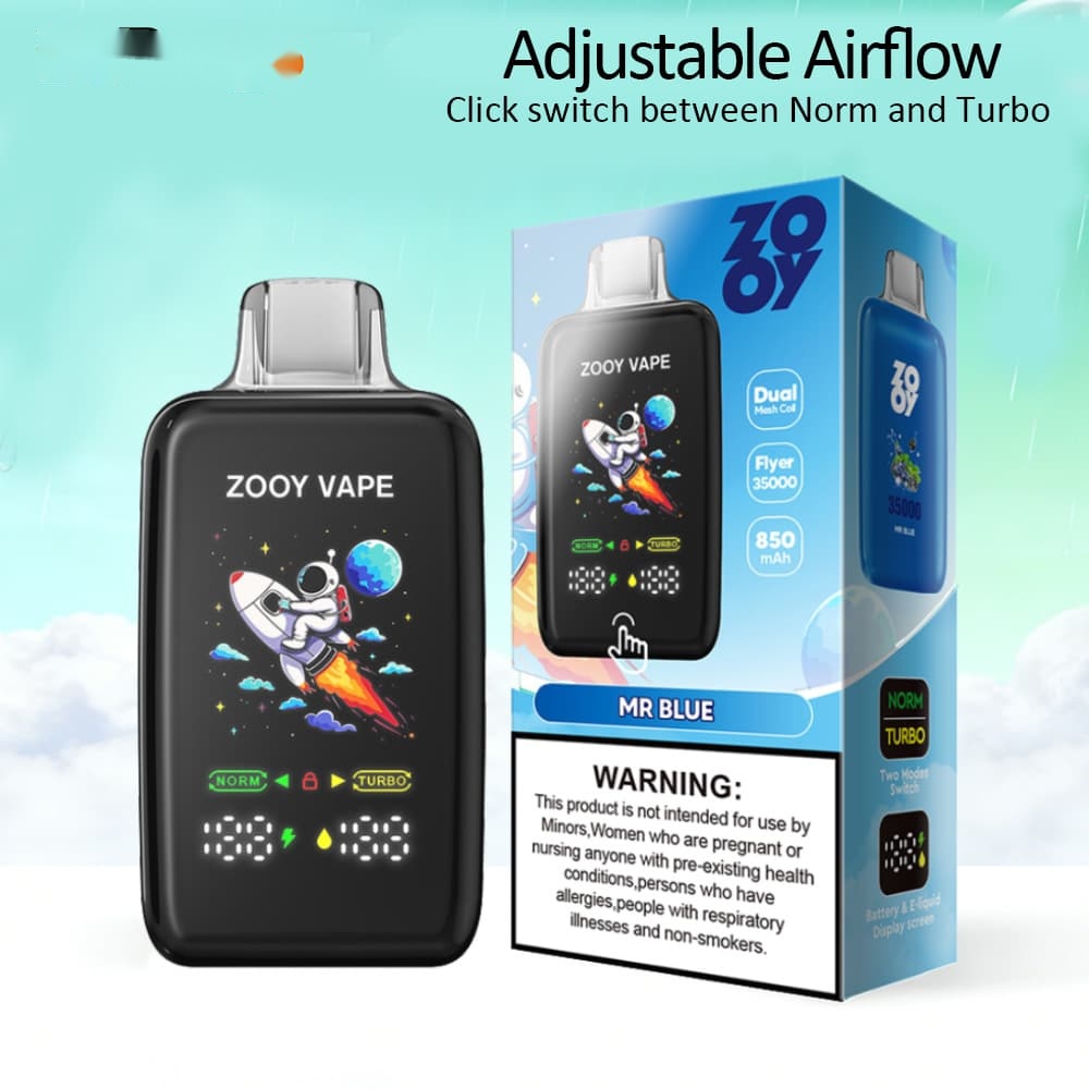 Zooy Flyer 35000 Puffs: Adjustable airflow, 850mAh battery, and dual mesh coils deliver rich vapor and flavor. Features a smart display with Standard/Turbo modes and Type‑C charging for convenience.