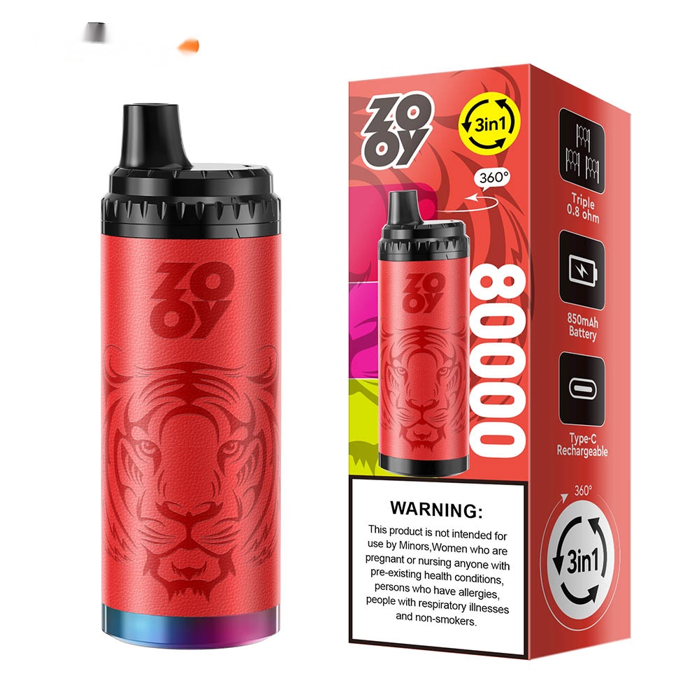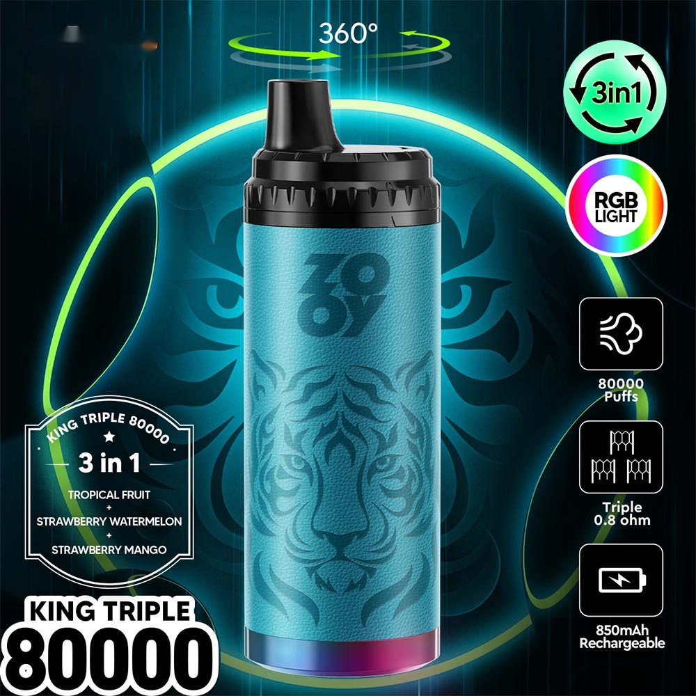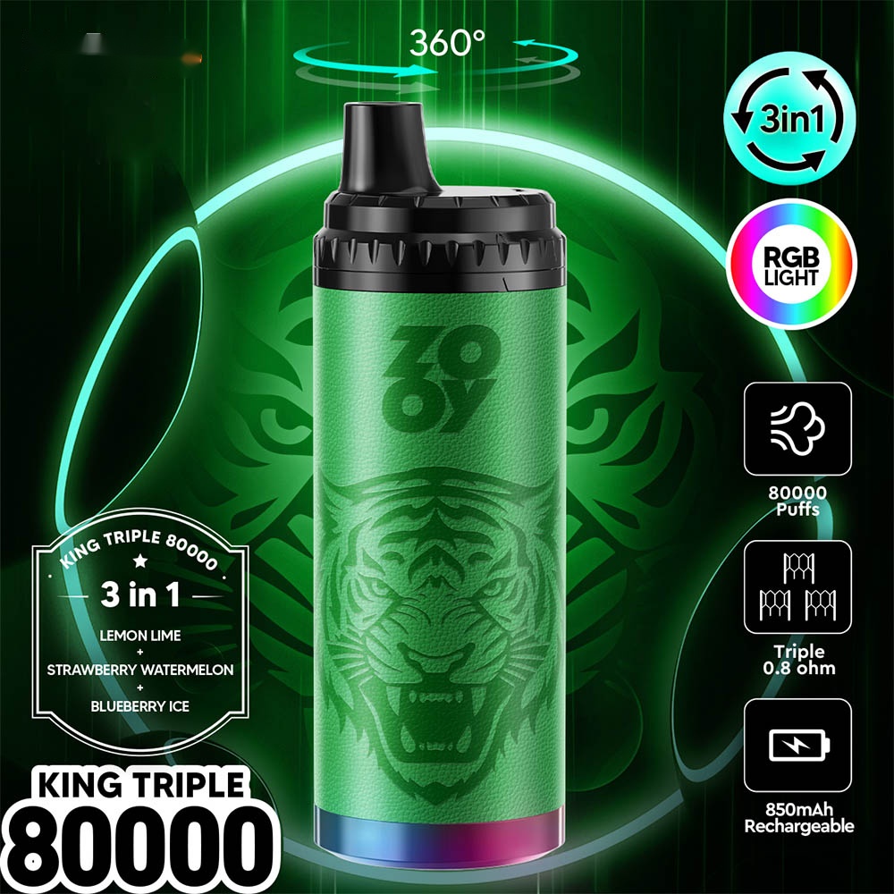 ZOOY King Triple 80000: Triple Flavors, Redefined Experience. The first 3-in-1 device for seamless switching between three exclusive aromas. Triple mesh coil delivers rich taste and consistent flavor. With 850mAh battery, Type-C charging, optional 0% ~ 5% nicotine, and stylish triple-color lighting. Redefine your daily routine with compact design, setting a new standard.
